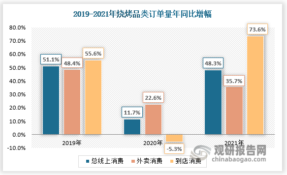 分年份來看,2018年,我國燒烤業在消費升級的推動下,正式邁入以高質量發展為主要方向的新時代;2019年,新冠疫情爆發,行業規模出現大幅下降,但隨著黨中央高效統籌防控和經濟社會發展的決策部署下,行業企業積極自救互救,成為近年來餐飲業態中利潤最高、增長最快的品類。美團數據顯示,2021年燒烤訂單量大幅回暖,總線上消費同比增長48.3%,外賣年同比張幅35.79%,到店消費增幅尤為明顯,同比漲幅73.6%。2021年燒烤行業市場規模達2149億元,基本恢復至疫情前水平。