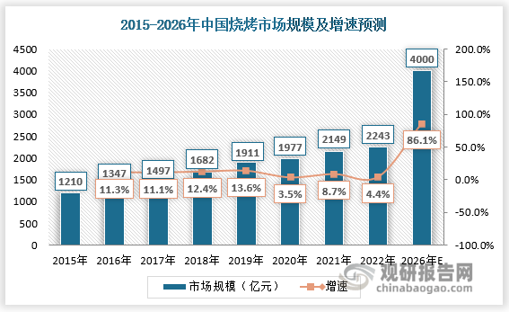 2022年12月7日,國務院聯防聯控機制相繼出臺“二十條”、“新十條” 措施,進一步優化調整疫情防控工作。2023年,在我國國民整體消費復蘇的大背景下,燒烤火爆開局,隨著優化疫情防控措施的進一步落實以及擴大內需戰略的深入實施、經濟逐步復蘇,消費需求將繼續釋放,預計2023年的燒烤市場規模勢必會有一波上漲。此外,參考歷史增速,按照未來4年11%的市場增速,2026年我國燒烤市場規模將會達到4000億元。