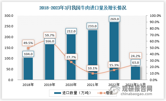 牛肉方面,由於缺乏高檔肉牛優良品種和有效飼養技術、肉牛產業化程度較低、國產牛肉加工企業之間未形成統一的行業執行規范、分銷過程復雜混亂等因素影響,當前我國肉牛業鏈條松散,所提供牛肉品質達不到消費者需求,因此我國高端牛肉主要依賴進口。日本掌握全球絕大多數的優質和牛,但由於我國對日本牛肉在 2019 年底前一直處於禁運狀態,再加上和牛價格的高企,令即使在盛產和牛且消費能力更強的日本,以和牛為主要食材的高端烤肉隻能是小眾市場。因此我國大部分高端牛肉的消費主要通過從澳大利亞、新西蘭、阿根廷等國傢進口來滿足。其中,澳大利亞是主要和牛進口國傢,在我國進口和牛貿易中占有83%的市場份額。從牛肉進口總量來看,盡管2022年國內市場面臨消費長期萎靡、人民幣貶值等諸多不利因素,中國大陸牛肉進口量依然維持強勁增長態勢,累計進口牛肉269萬噸,趕超2021年全年進口總量(233萬噸),同比增幅達15%,我國對高端牛肉的進口需求量持續旺盛。
