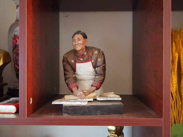拉面哥的院子是一位熱情粉絲包工包料替他翻修的,屋裡懸掛或安放著很多別人贈送的毛筆書畫,“博古架”(當地稱為櫥櫃)上還有一尊生動的“拉面哥”雕塑。“這個捏得真怪好!我也不知道是誰送的。”拉面嫂隻記得,那是在2021年,“他/她是從墻頭上遞過來的,我都沒見到人。”