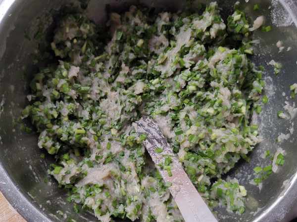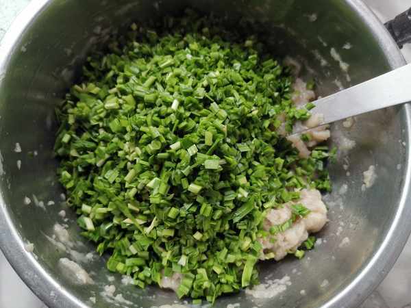 第五步:把韭菜切成碎末放入鮁魚餡中。如果喜歡肉餡,鮁魚肉中也可以放一些五花肉會更香。因為我不喜歡肉,所以只用鮁魚肉更鮮美。