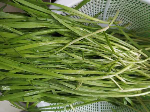 第二步:韭菜少許,摘洗乾淨控幹水分,這個季節的韭菜很好吃,特別鮮嫩,再過一陣子露天韭菜就沒有了,就是大棚種植的韭菜了。