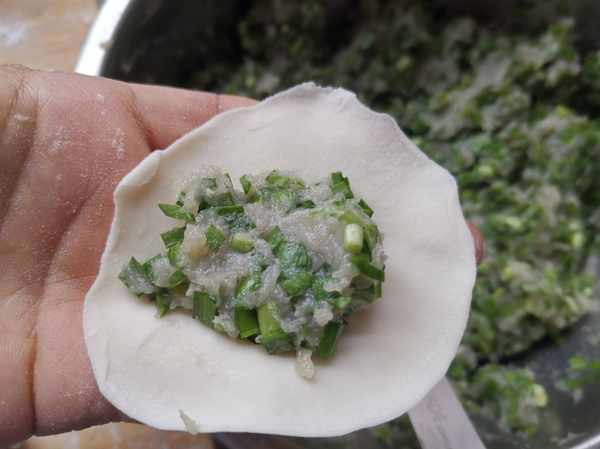 第七步:把麵團揉勻搓成長條,揪成小劑子按扁,擀成餃子皮,放上適量得餡料。
