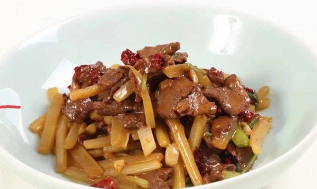 此菜的靈感來源於川菜麻婆豆腐,靈魂郫縣豆瓣醬和火鍋底料小火炒香,與切方塊的攪團一同燒入味,加上過油牛肉片,成菜麻辣鮮香、滋味濃鬱,真的好吃極瞭。