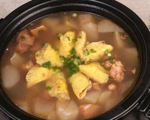 4.每隻陶盆內依次分裝入壓好的白蘿卜塊、藕塊、豬蹄塊、排骨塊、雞塊、豬肘塊,倒入原湯,調入鹽、雞汁、白胡椒粉,盛至九分滿,覆保鮮膜上籠蒸2個小時。