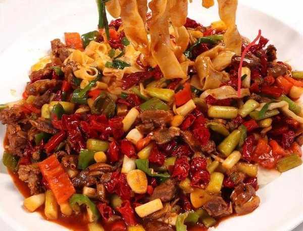 這道菜的做法源自新疆大盤雞,盤底墊上拉條子面,蓋上一層生炒乳鴿,澆上菜的湯汁,成菜之後滋味濃鬱,看著更上檔次。