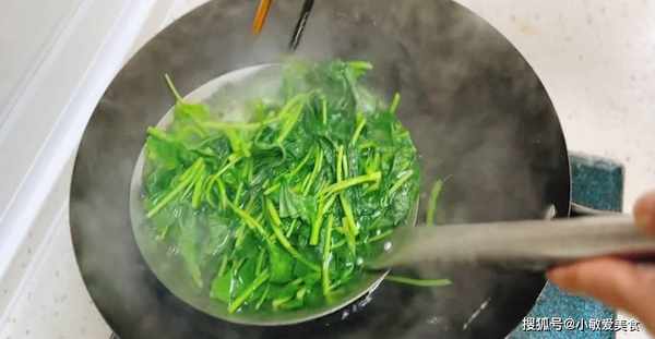 4、起鍋燒水,水多一點,燒開以後倒入紅薯葉焯水,用筷子翻拌一下,這樣能讓紅薯葉子受熱均勻,不容易發黑。12秒即可撈出,用冷水沖涼,沖涼以後瀝幹水分備用。