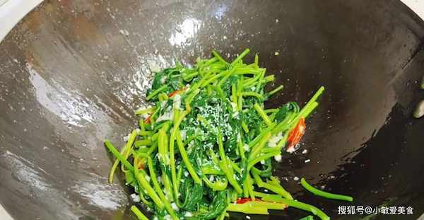 5、鍋中放入豬油,用油潤鍋,五成油溫加一點鹽,依次快速倒入蒜米、幹辣椒、紅薯葉,火開到最大,快速翻炒,讓大蒜、幹辣椒鹽味滲入紅薯葉,翻炒均勻就可以出鍋瞭。