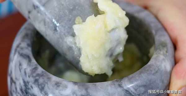 5、準備一頭大蒜,加少許鹽,把它搗成細膩的蒜泥。
