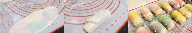 1.將油皮材料混合揉勻到出手套膜,蓋保鮮膜松弛半小時。將油酥材料混合揉勻,分4-5份,分別加入一些色素揉勻,蓋保鮮膜松弛半小時。如果天氣熱的時候,油酥要放進冰箱冷藏松弛。不然包油酥的時候容易化掉。