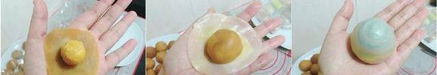 3.蛋黃如果是買的真空包裝的,記得要泡酒或者料酒半小時,然後用烤箱175度烤7-8分鐘,這樣就沒有腥兒味瞭。處理好蛋黃可以做皮瞭。取一個油皮,包入一份油酥,一份油酥如果做的4色的就是4個球,如果是5色的就是5個球,每個顏色一個。包油酥的時候不要留空,要包緊,這樣搟出來的皮不容易破酥。