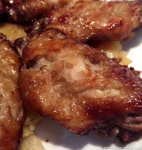 2、預熱烤箱200度,利用這個時間切一點土豆片或者茄子片。準備一個錫紙,塗一層油,然後將土豆片鋪在上面,在將醃制好的雞翅中鋪在土豆上,皮朝上刷一層蜂蜜(少刷一點點就行,如果蜂蜜太濃稠,可以加水調和一下再刷),再撒一點孜然粉,最後將錫紙的邊緣折起來,防止油脂漏出。中層上下火200度烤15分鐘。