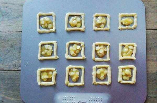 5.拿著裱花袋在烤盤中擠出想要的形狀,再填入制作好的糖心,放入預熱好的烤箱,175度上下管烤制12分鐘即可。