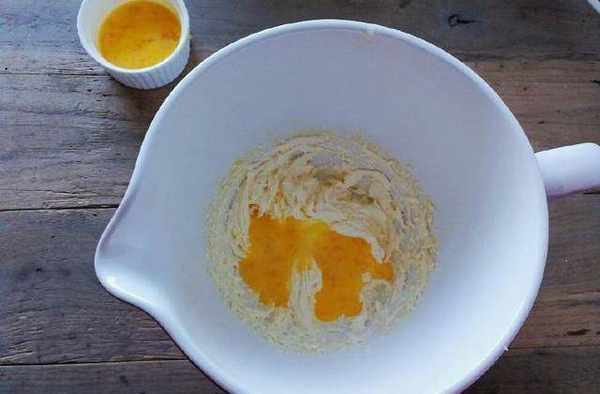 3.制作餅幹底,把黃油和糖粉打發成淺黃,體積膨大點就行,再把雞蛋液打散,分3次倒入黃油中,每次打發吸收後再倒入,這樣不會油水分離