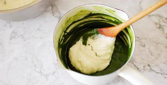6、把淡奶油分幾次加入抹茶奶糊中攪拌。
