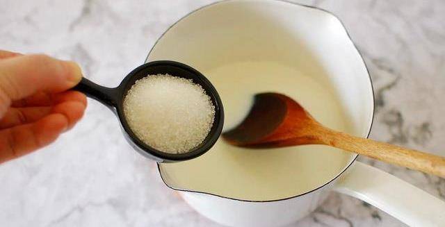 1、容器中倒入牛奶,再加30g白砂糖攪拌均勻。