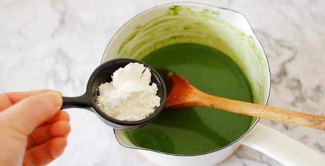 3、加入10g玉米淀粉到抹茶牛奶混合液中。