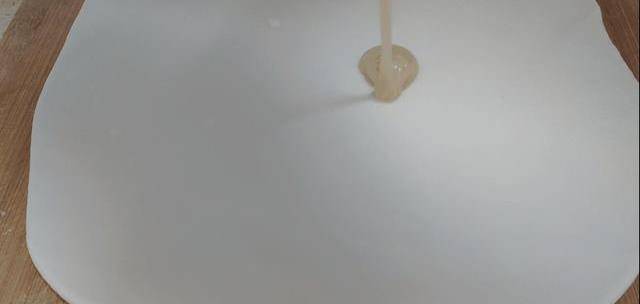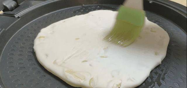 12.預熱電餅鐺,倒油,將餅胚放入,小火烙。餅胚表面刷一層油,防止水分流失。