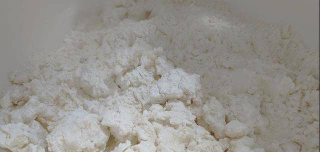 1.面粉放入和面盆中,一半放熱水,一半放涼水,用筷子攪拌成絮狀。
