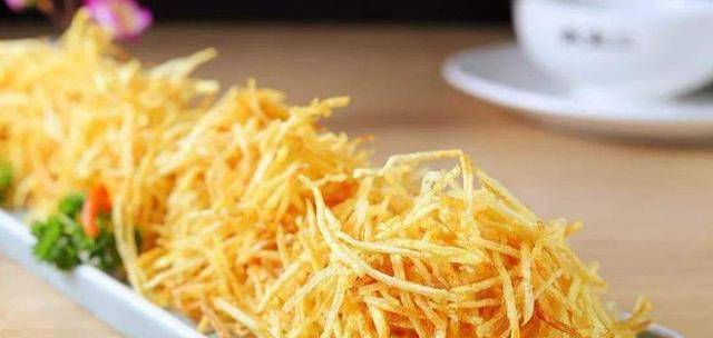 濾幹凈油中的殘渣,依舊開小火,用油的餘溫將香蕉炸至金黃即可撈出,註意這一步油溫不能高,否則容易炸糊,炸好之後將香蕉均勻地裹一層沙拉醬,再在炸好的土豆絲中沾一層土豆絲即可,同時可以用手撒上去土豆絲,挨個弄好之後擺盤就完成啦,剩餘的土豆絲孩子們也可以沾番茄醬吃!