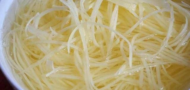 接下來我們把鍋燒熱,鍋燒熱之後加入適量的油準備炸土豆絲,用筷子戳進油裡有冒泡即可,然後將控過水的土豆絲下鍋,下鍋之後開大火將土豆絲炸得熟透,過程中要不斷的攪拌一下土豆絲防止粘連,土豆絲熟透之後即可撈出;開小火等油溫降一些將土豆絲放進鍋中復炸一下,這一步是為瞭將土豆絲炸至金黃,隨後即可撈出備用。