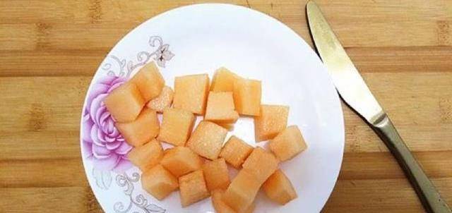 哈密瓜切成小塊,準備個碗,放入30克,藕粉,在註入60克清水,攪拌均勻就可以。