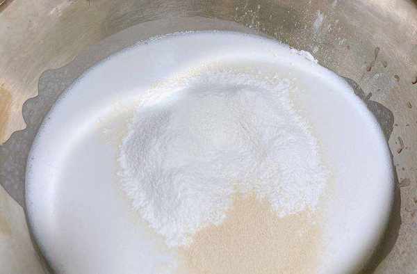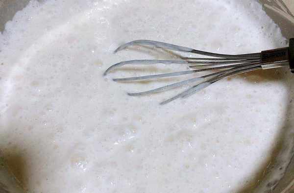 打好的米槳倒入盆中,加入面粉和酵母攪拌均勻。