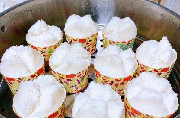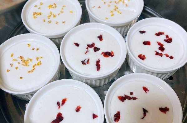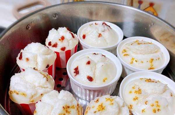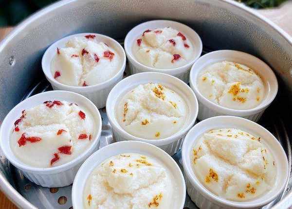 加入桂花,蔓越莓,葡萄幹或者自己喜歡的果幹都可以。 水開後大火蒸20分鐘,要想開花一定要水開再上鍋大火蒸,然後悶3分鐘就可以出鍋瞭。