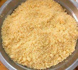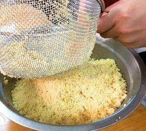 趁熱用勺子壓成粉狀,然後用大孔漏篩過篩(大孔的比較容易過篩,過篩的目的是為瞭入口即化),這一步比較費時費力。不追求口感的,這一步可省略。