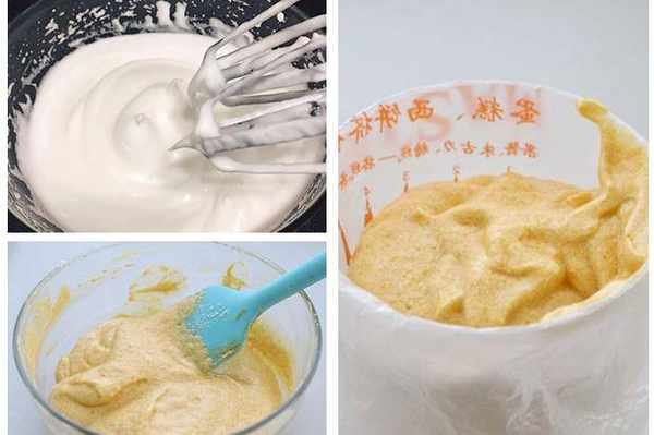 5、取1/3的蛋白霜,倒進蛋黃糊中,用刮刀翻拌均勻,再將拌好的面糊倒回到剩餘2/3的蛋白霜裡,繼續翻拌,註意不要畫圈圈攪拌哦,這樣會消泡的。然後將拌勻的面糊,倒入表花袋裡;