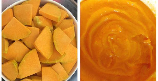 1、南瓜去皮切塊放鍋裡蒸,蒸熟後搗成泥。