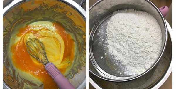 3、蛋黃中加入晾涼的南瓜泥,攪拌均勻,然後篩入低筋面粉再次攪拌均勻。