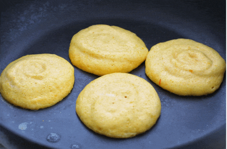 6、取一平底鍋加熱,不用放油,鍋熱後改小火,擠入面糊,呈圓形狀(可以稍微高一些好看),可以加入2勺清水,蓋上蓋子燜兩分鐘。燜至定型變色後,翻到另一面繼續煎。直至兩面都變成焦黃色就可以出鍋啦!