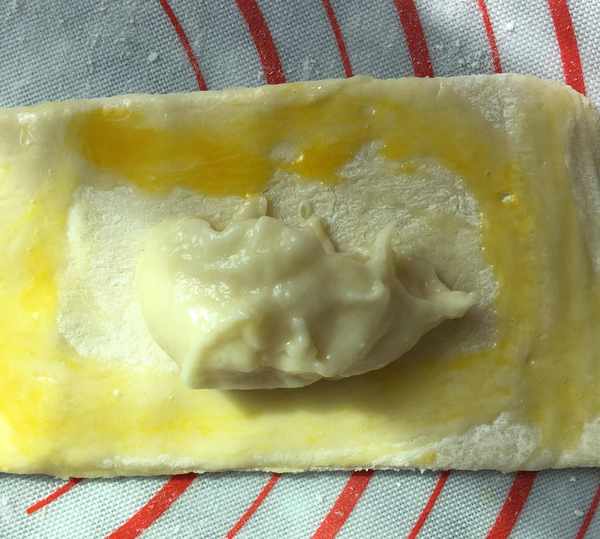 取一個切好的面皮,放入適量榴蓮餡,四周刷上蛋黃液,把一邊折疊過來,用叉子把邊緣壓緊。