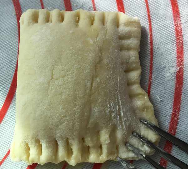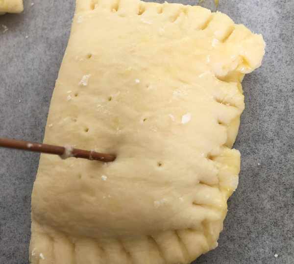 然後在壓好的面坯上用牙簽戳一些洞,以防止烤的時候榴蓮餡爆出來。