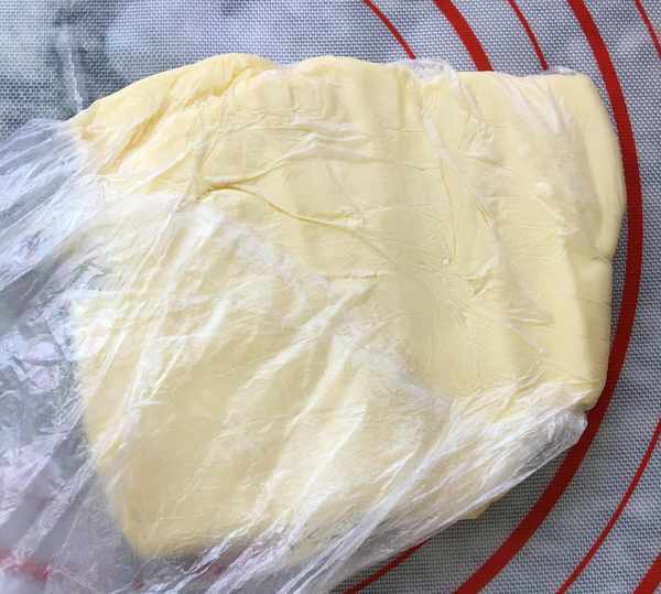 揉搓成無幹面粉的面團,放入保鮮袋,冰箱冷藏20分鐘。同時裹入用的黃油也一同冷藏一會。