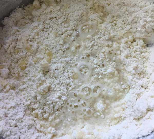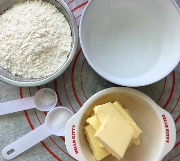 其次,加到面粉裡的黃油,可以先用微波爐加熱後,加到面粉裡,也可以直接加入面粉用手搓碎後再加水攪拌。