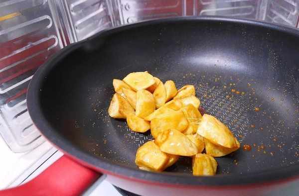 接著將炸好的紅薯放入,快速地翻動,讓焦糖均勻的包覆在紅薯上。