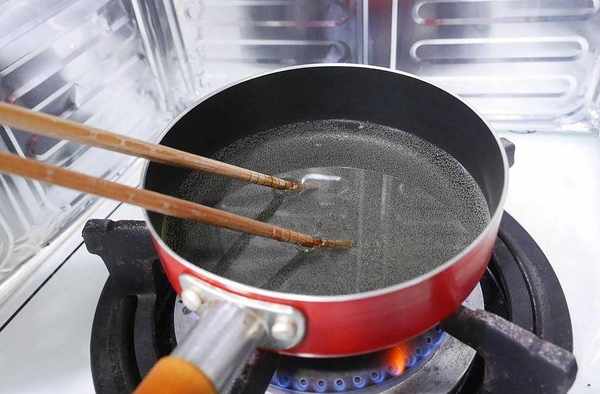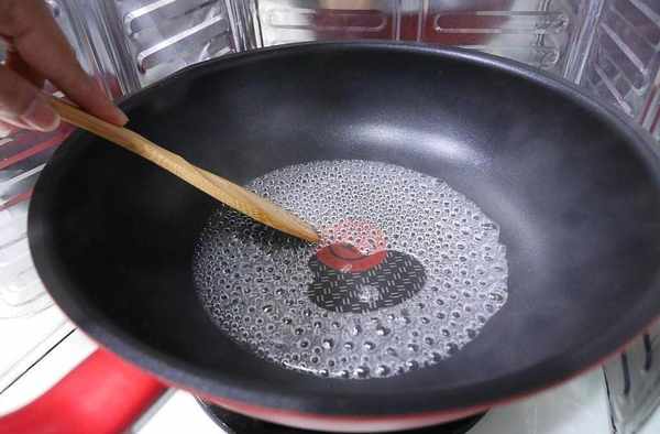 將白糖和水倒入鍋中,慢慢煮,用湯匙翻動。(建議可以準備多一倍的量,讓糖衣可以均勻在炸好的番薯上。)