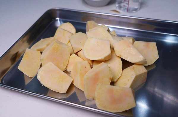 將紅薯削皮後,用滾刀切成小塊。