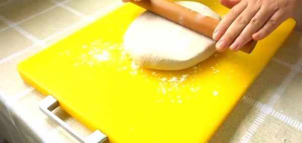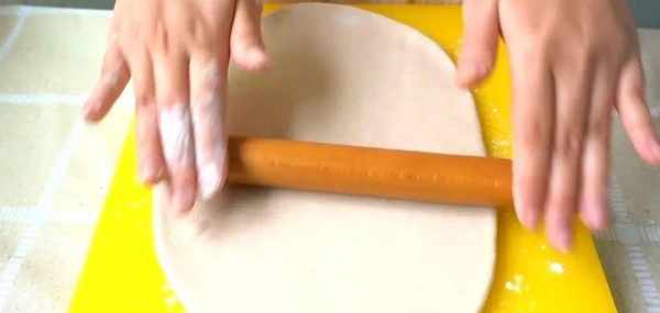 在案板上面撒上一點幹面粉,把面團搟成橢圓形,卷起來,接口的地方收緊。