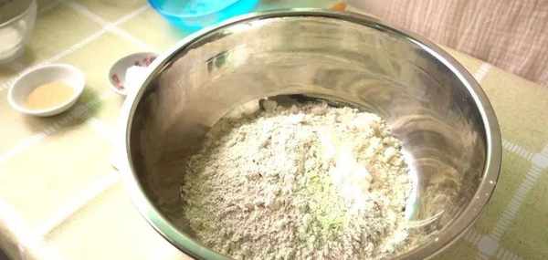 先在揉面盆中加入高筋面粉,接下來加入黑麥面粉,高活性幹酵母,白砂糖還有鹽。