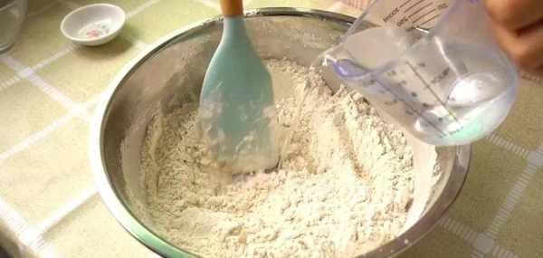 先用矽膠鏟把所有材料攪拌均勻,拌勻以後倒入清水,一邊倒一邊攪拌。