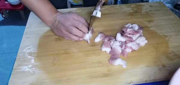 2、清理幹凈以後,把肥肉和瘦肉區分,瘦肉和肥肉的一邊切成薄薄的大片備用。