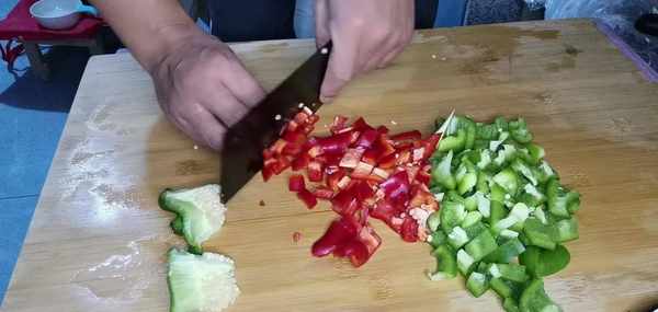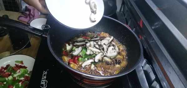 8、鍋開下入切好的大青椒、大紅椒和切好的香菇。
