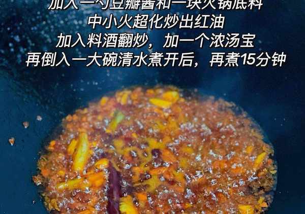 制作方法2、加入豆瓣醬、火鍋底料、炒出紅油加入料酒和濃湯寶,一碗清水煮開