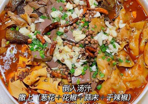制作方法5、撒上蔥花、花椒、蒜末、幹辣椒:淋上熱油