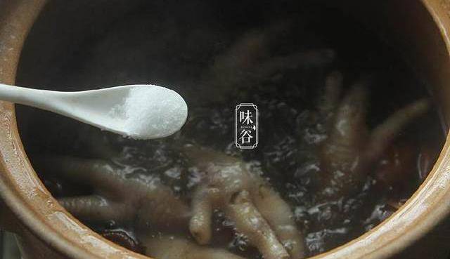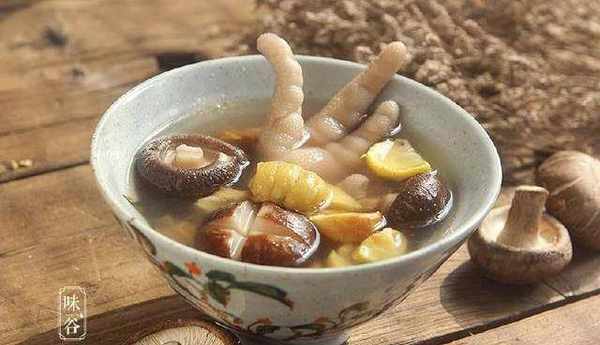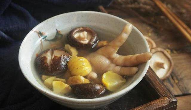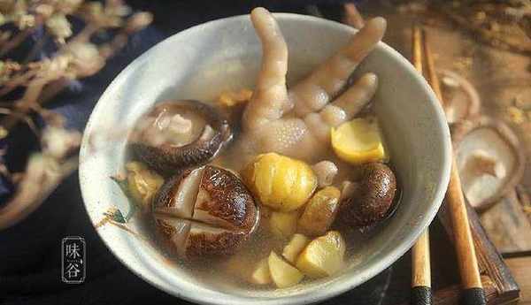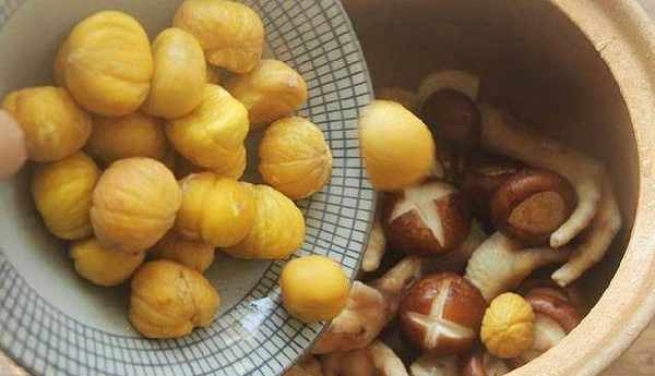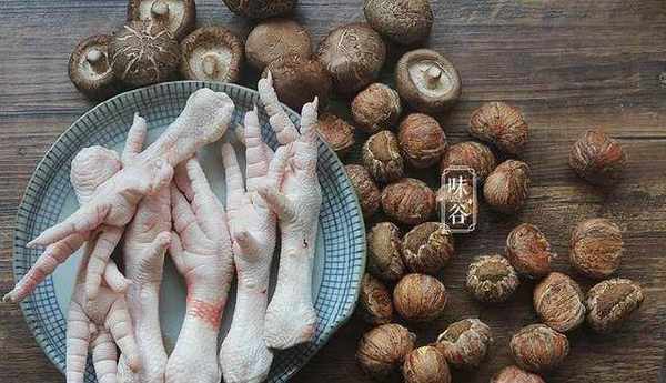 【材料】:雞腳6隻、栗子200克、香菇10朵、薑3片、鹽適量、