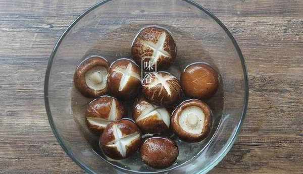 4、將鮮菇洗凈,浸泡一段時間後,去蒂,用刀給香菇切十字花;(方便入味)