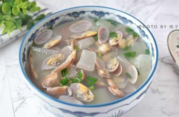 【材料】冬瓜:400克、花甲:350克、幹貝:適量、鹽:適量、蔥花:適量、香油:少許